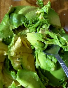 - Scoop the flesh from the skin into a bowl. With a potato masher or a fork, mash the avocado till it is a chunky texture.