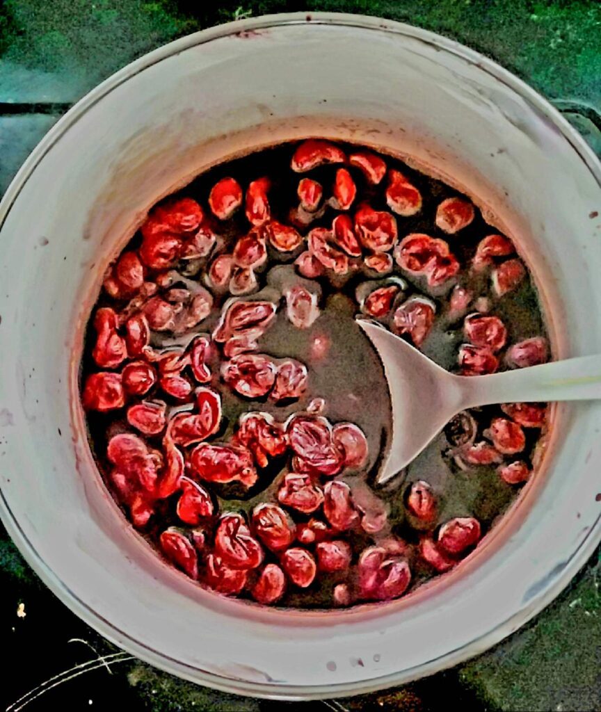 There’s something wonderful about picking cherries right from the tree on a sunny afternoon. I love making this sour cherry syrup with cherries I’ve picked myself from a field near my house. My guess is that these are probably wild cherries since they’re delightfully tart! Whether you’re using sweet or sour cherries, the first thing to do is wash them really well. Then, carefully remove the pits. It takes a little patience, but there’s something calming about the process. Plus, the payoff is worth it. Nothing tastes like summer more than homemade cherry syrup.