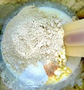 - In a medium-sized mixing bowl, with a wire whisk or fork, mix together both flours, sugar, baking powder, baking soda, pumpkin pie spice or cinnamon, and salt.