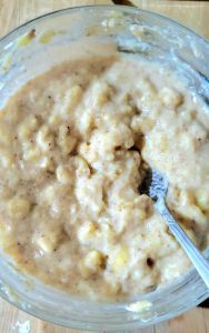 - Mash the bananas in a large mixin bowl using a fork or potato masher until mostly smooth but still a little chunky.
