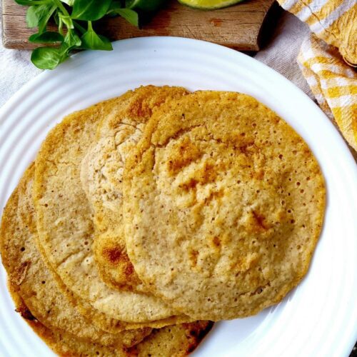 What I really love about these tortillas are that they stay soft and pliable and reheat easily on the stoveto or in the oven. They’re cooked just like a crepe or pancake and do not require any leavening agent such as baking powder. And you can either make them in a blender or in a bowl.
